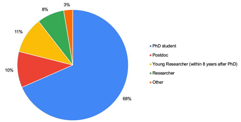 A total of 38 respondents (participants of 3DForEcoTech activities) took part in the survey. The majority of respondents were PhD students, representing 68% of all respondents. This indicates that the training activities primarily attracted individuals at an early stage of their research careers. Overall, the respondents’ profile demonstrates a strong focus on supporting the development of emerging scholars in the field.