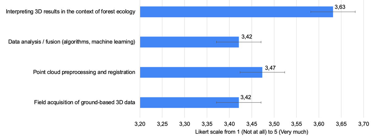 Based on their participation in the 3DForEcoTech activities, respondents evaluated improvements in their practical skills across four key areas. The highest gains were observed in interpreting 3D results within the context of forest ecology (mean = 3.63; SD = 1.13) and in point cloud preprocessing and registration (mean = 3.47; SD = 1.16).