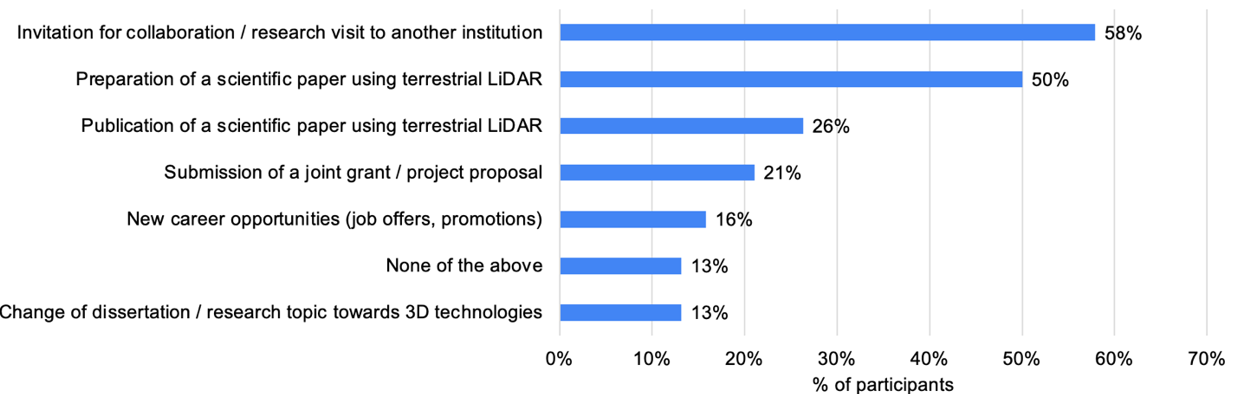 Participation in 3DForEcoTech activities led to a range of positive outcomes: invitations for collaboration or research visits – 58%, preparation of scientific papers using terrestrial LiDAR – 50%, publication of scientific papers – 26%, and submission of joint grants – 21%. Fewer respondents indicated new career opportunities (16%) or a change of dissertation/research topic toward 3D technologies (13%). Overall, the program primarily fostered scientific collaboration and research outputs.