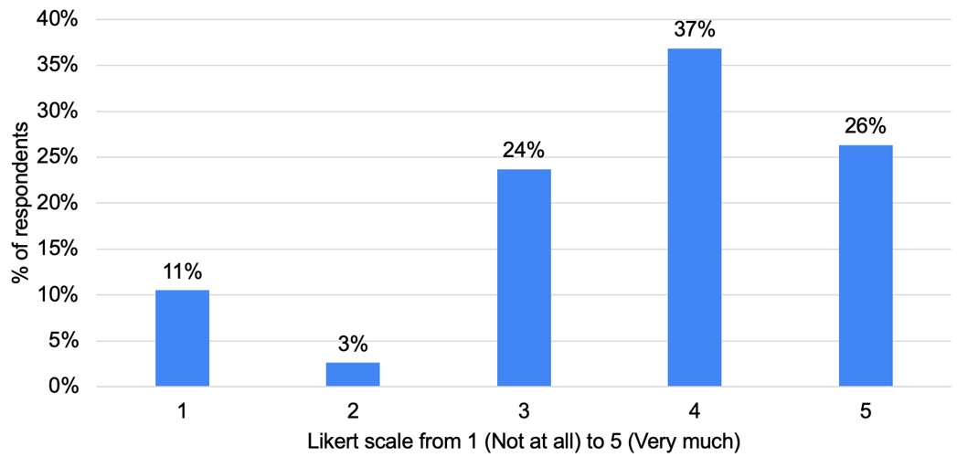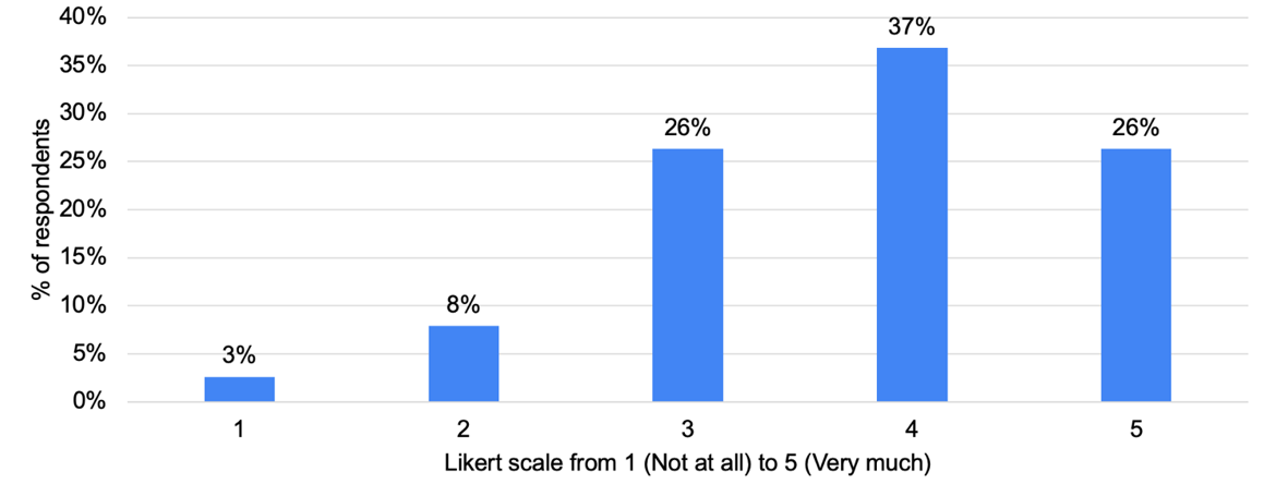 Participation in the activities positively influenced respondents’ career development, with an average rating of 3.76 points out of 5 (SD = 1.02). Most respondents rated the impact as moderate to high (37% gave a score of 4 and 26% gave a score of 5), while low ratings were rare, indicating meaningful professional development for the majority.